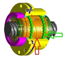 Na seta vermelha, o sistema para movimentação axial (linear), já a seta verde indica o sistema de rotação (radial), ou seja, possui dois sistemas independentes de rolagem das esferas, cada um dedicado à sua movimentação.